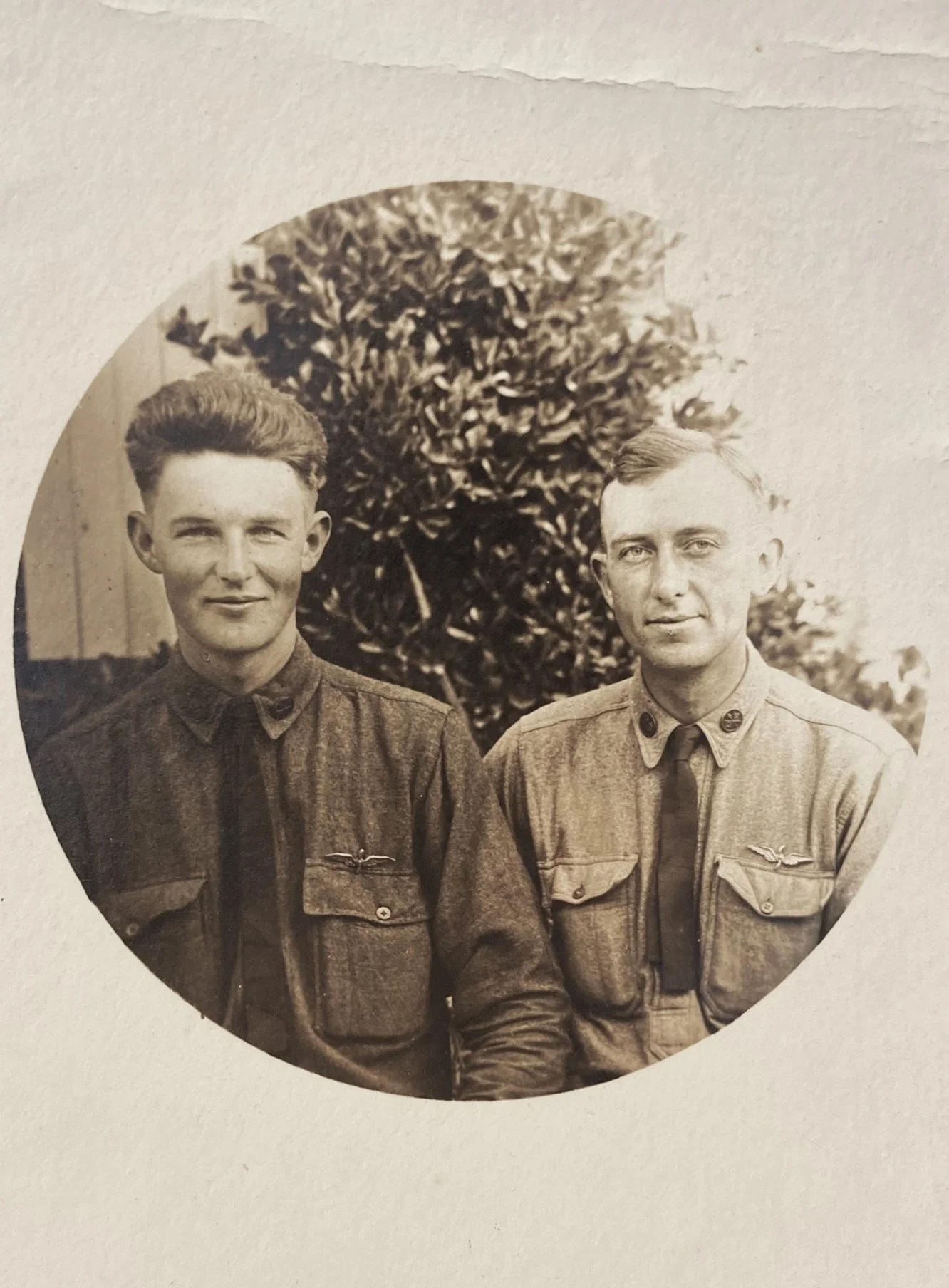 A comprehensive unit history of the 4th Motor Mechanics remains unavailable, but it appears that the regiment was first tasked with the maintenance and repair of AEF vehicles. However, the unit was redesignated in September as the 4th Air Service Motor Mechanics of the US Army Signal Corps, and they were employed in the repair and maintenance of aircraft. This overseas photograph depicts Robert with PFC Morgan Burkam while stationed in France. Notice the Air Service pins affixed to their uniforms.