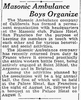 Shortly after returning from overseas, members of the Corps formed a permanent organization with headquarters at the Masonic Club at the Palace Hotel in San Francisco.