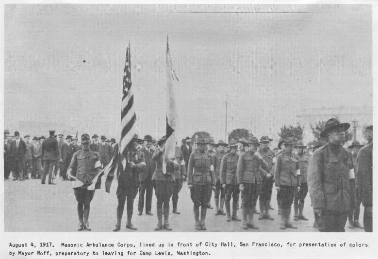 The Masonic Ambulance Corps was formed in May, 1917, by brothers from Alta Vista Lodge No. 464 and Bethlehem Lodge No. 453 in San Francisco, CA.