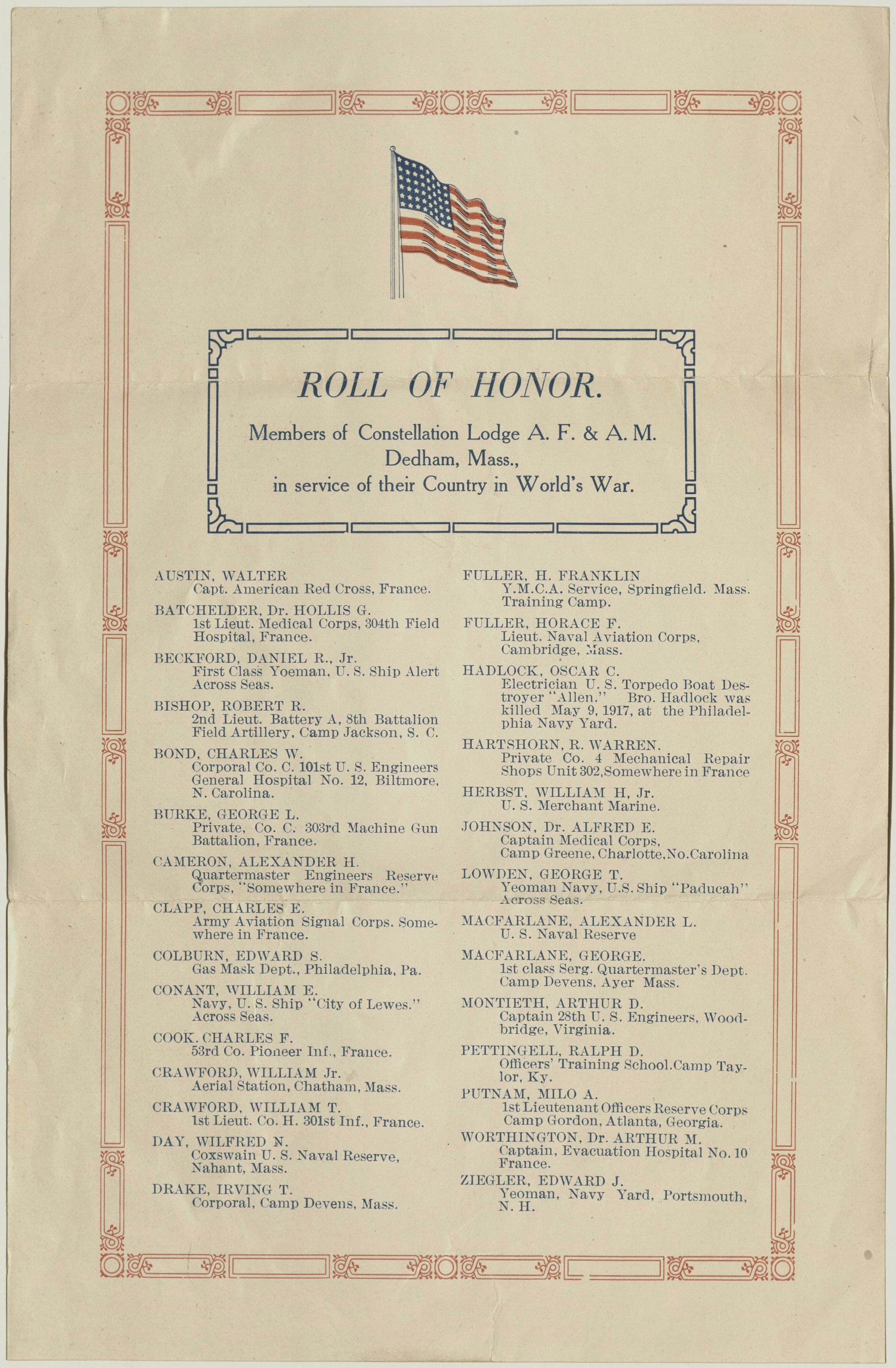 Constellation Lodge roll of honor, 1918. Scottish Rite Masonic Museum & Library, Gift of William Douglas Crawford, MA 001.429.