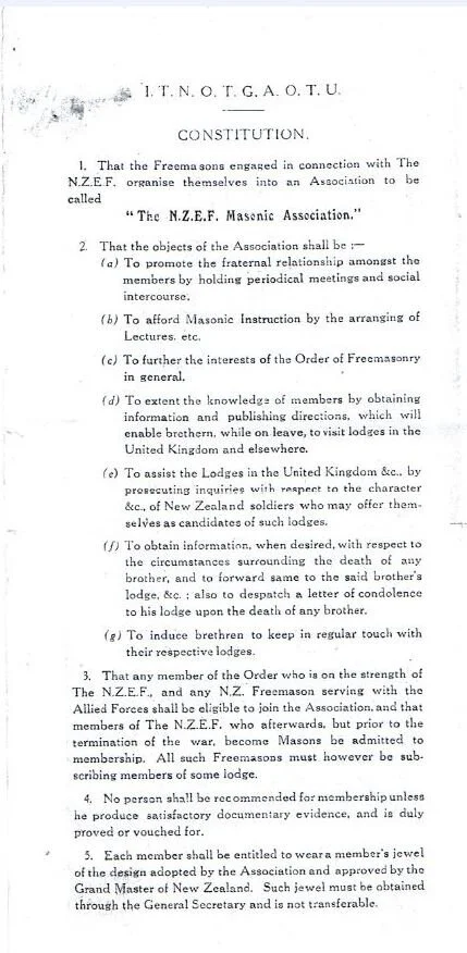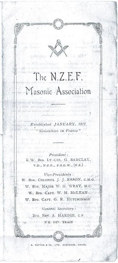 The NZEF (in Palestine & Egypt) Masonic Association met in a rather haphazard and fragmentary way, partly due to the mobile nature of the units in the theatre of the war. But the Masonic Association on the Western front and in Britain was much more substantial. I would recommend the paper of Bro. G. H. Robertson, and also the paper on Bro. Col. George Barclay from our transactions in March 1983, by Bro. K. Morrison.