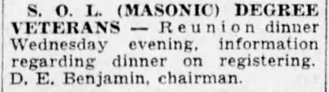 D. E. Benjamin - Chairman of the S.O.L. Degree Veterans. Detriot, Michigan Wolcknitz, Frank – Nickerson, Kansas Troxel, Paul F. – Old Erie Lodge No. 3, Warren, Ohio Kuhn, John A (1035). – Morning Dawn Lodge No. 7, Gallipolis, Ohio Safford, Harold R. – Morning Dawn Lodge No. 7, Gallipolis, Ohio Bergen Jr., Charles S. – St. John’s Lodge No. 12, Dayton, Ohio Earhart, Glen W. – St. John’s Lodge No. 12, Dayton, Ohio King, Harry R. – Western Star Lodge No. 21, Youngstown, Ohio Moore, John P.? – Western Star Lodge No. 21, Youngstown, Ohio Johnson, Peter (1046) – Pickaway Lodge No. 23, Circleville, Ohio Lynch, Raymond D. (193) – Warren Lodge No. 24, Piqua, Ohio Horn, Burnice L. – Paramuthia Lodge No. 25, Athens, Ohio Brown, Lem C. – Columbus Lodge No. 30, Columbus, Ohio Huseman, Theodore - Columbus Lodge No. 30, Columbus, Ohio Voegel, Leonard (397) – Columbus Lodge No. 30, Columbus, Ohio Bechtel, Harvey G. – Ebenezer Lodge No. 33, Wooster, Ohio McMullen, Paul H. – Highland Lodge No. 38, Hillsboro, Ohio Bassett, Noah H. (546) – Aurora Lodge No. 48, Portsmouth, Ohio Synder, Otis S. – Aurora Lodge No. 48, Portsmouth, Ohio Fridline, Guy C. – Lancaster Lodge No. 57, Lancaster, Ohio O’Dell, Louis V. – Mt. Vernon Lodge No. 64, Norwalk, Ohio Katz, Gabriel JH. – Marion Lodge No. 70, Marion, Ohio McDermott, Edgar H. – Seville Lodge No. 74, Seville, Ohio Wisnewski, Frank E. – La Fayette Lodge No. 81, Cincinnati, Ohio Bloom, John H. – Bolivar Lodge No. 82, Eaton, Preble County, Ohio Adams, William E. – Akron Lodge No. 83, Akron, Ohio Steidle, Walter M. – Akron Lodge No. 83, Akron, Ohio Abel, John B. – Coshocton Lodge No. 96, Coshocton, Ohio Franks, H. S. – Spartan Lodge No. 126, Millersburg, Ohio Dessenberg, L. C. – Ashland Lodge No. 151, Ashland, Ohio Francis, W. H. H. (1056) – Irville Lodge No. 185, Nashpol, Ohio Jenkins, Berkley E. (137) – Lawrence Lodge No. 198, Ironton, Ohio Owrey, William T. – Lawrence Lodge No. 198, Ironton, Ohio Shield, Clarence Moses - Richland Lodge No. 201, Plymouth, Ohio Bohnstengel, Herman – Hanselmann Lodge No. 208, Ohio Hague, John T. (409) – Olive Lodge No. 210, Mt. Epheanir, Ohio Poling, Charles N. – Van Wert Lodge No. 218, Van Wert, Ohio Metcalf, Harry D. – Groveport Lodge No. 240, Groveport, Ohio Curdes, J. Henry – Napoleon Lodge No. 256, Napoleon, Ohio Wilkie Jr., Zeller (452) – Germantown Lodge No. 257, Germantown, Ohio Simpson, Welton F. – Rockton Lodge No. 316, Kent, Ohio Birney, Samuel A. – Unionport Lodge No. 333, Unionport, Ohio Morley, Alfred Charles – Geneva Lodge No. 334, Geneva, Ohio Shick, Henry – Belle Center Lodge No. 347, Belle Center, Ohio Hewitt, W. C. – Kilwinning Lodge No. 356, Cincinnati, Ohio Thomas, Edwin T. – Centreville Lodge No. 371, Thurman, Ohio Graham, Clarence R. – Oberlin Lodge No. 380, Oberlin, Ohio Smith, D. W. – Berea Lodge No. 382, Berea, Ohio Ritsman, E. P. – Sanford L. Collins Lodge No. 396, Toledo, Ohio Fanning, Fred M. - Brooklyn Lodge No. 454, Cleveland, Ohio Crampton, R. J. - Woodward Lodge No. 508, Cleveland, Ohio Fredricks, Herman - Collingwood Lodge No. 582, Cleveland, Ohio Marcolin, Fred W. - Euclid Lodge No. 599, Cleveland, Ohio Brughwick, Ed - Brenton D. Babcock Lodge No. 600, Cleveland, Ohio Marrick, W. G. - West LaFayette Lodge No. 602, West LaFayette, Ohio Blue, Edwin J. - O. N. Steele Lodge No. 621, Cleveland, Ohio Hawkins, Edson K. - O. N. Steele Lodge No. 621, Cleveland, Ohio Jackson, G. H. - O. N. Steele Lodge No. 621, Cleveland, Ohio Oldach, Ernest - O. N. Steele Lodge No. 621, Cleveland, Ohio Schmidt, W. C. - O. N. Steele Lodge No. 621, Cleveland, Ohio Shotwell, Harry - O. N. Steele Lodge No. 621, Cleveland, Ohio Sherrer, George E. - Ellbrook Lodge No. 634, Cleveland, Ohio Bolz, A. C. - Pentalpha Lodge No. 636, East Cleveland, Ohio Fulton, William D. - Forest Hill Lodge No. 644, East Cleveland, Ohio Cheyney, A. A. - Service Lodge No. 658, Cleveland, Ohio Day, Arthur E. - Service Lodge No. 658, Cleveland, Ohio Wood, Roy A. - Service Lodge No. 658, Cleveland, Ohio Noel, R. C. - Service Lodge No. 658, Cleveland, Ohio Mitchell, Carl - Marion Lodge No. 70, Marion, Ohio Hopkins, J. Kent - Fayette Lodge No. 107, Washington C. H., Ohio Hoffman, F. D. - McMillan Lodge No. 141, Cincinnati, Ohio Thomas, Lee R. - Rubicon Lodge No. 237, Toledo, Ohio Beckwith, Jean Leroy - Rockton Lodge No. 316, Kent, Ohio